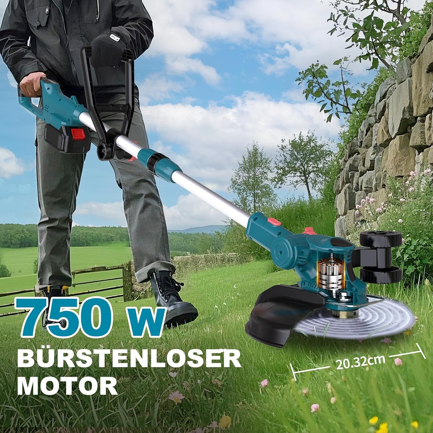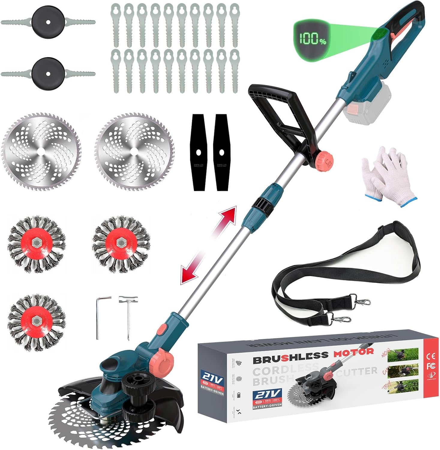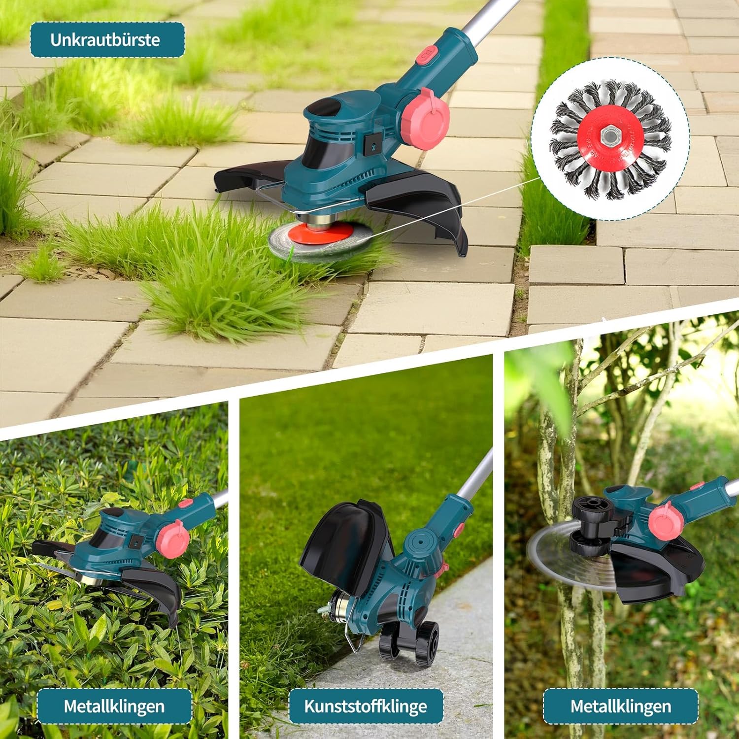 Po specifikacijah proizvajalca je združljiv z več vrstami rezil (žično, kovinsko, plastično, ščetka za plevel).