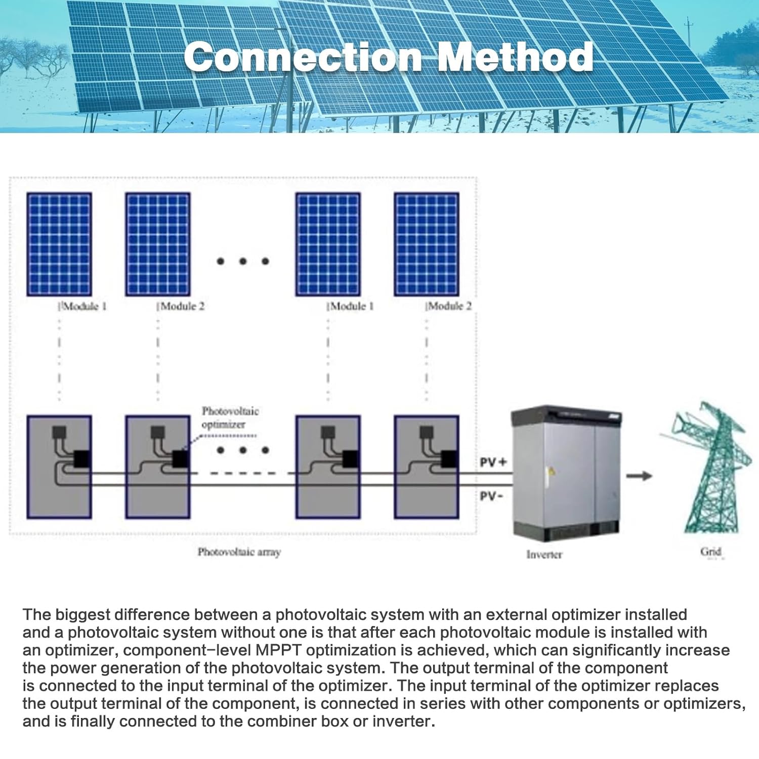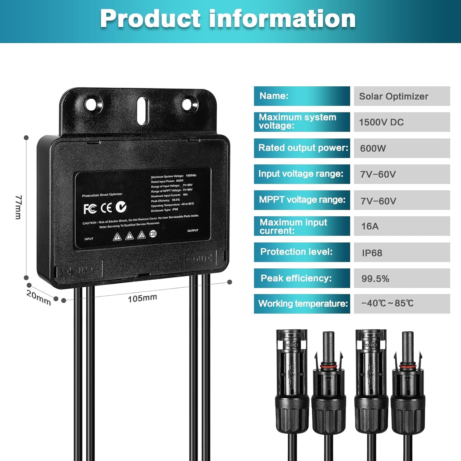 Optimizator izstopa z izredno visoko učinkovitostjo (do 99,5%) in širokim vhodnim napetostnim razponom (7-60V), kar zagotavlja prilagodljivost različnim konfiguracijam. Zaradi robustne, vodoodporne (IP68) in temperaturno odporne zasnove (-40°C do 85°C) je primeren za montažo na prostem in vzdrži tudi najtežje vremenske pogoje.